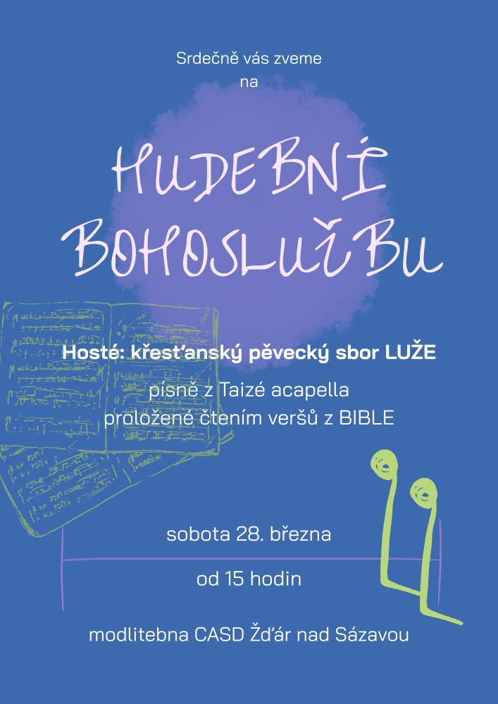 Během hudební bohoslužby zazní písně z Taizé acapella v podání křesťanského pěveckého sboru LUŽE, které budou proložené čtením veršů z BIBLE.